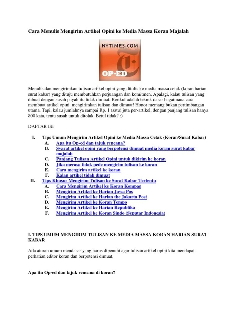 Honor tersebut akan diberikan trasfer setelah 2 atau 3 hari sejak karya sobat tayang di medianya mereka. Menulis dan mengirimkan tulisan artikel opini yang ditulis ke media massa cetak (koran harian surat kabar) yang dituju membutuhkan perjuangan dan komitmen. Menulis di media cetak indonesia (1) bagi siapa saja yg berminat mengirim tulisan ke media cetak (koran/majalah), maka berikut sedikit tips dari saya: Teknis standar pengiriman naskah hal pertama yang harus diperhatikan seorang penulis sebelum mengirimkan cerpen ke suatu media adalah kecenderungan tema cerpen yang biasa dimuat oleh media tersebut. Tulisan ringan rp100.000, cerpen dan esai rp300.000, puisi rp250.000 dan resensi buku rp200.000. Server ftp memungkinkan anda untuk mengatur file anda seperti yang anda lakukan di file explorer di desktop, memberikan akses bagi pengguna lain untuk mengunduh file dari jarak jauh, dan mengatur izin khusus atas apa yang pengguna miliki. Gambar kirim via pos ke alamat harian kompas. Mulai dari definisi, sejarah, plus minus, hingga cara investasinya, simak selengkapnya, ya! cara menulis dan mengirim artikel ke media online yang akan kita bahas kali ini bisa menjadi panduan bagi anda yang hobi menulis. Siapapun bisa mengirim tulisan ke kr dan berpeluang di muat. Sobat bisa melihat tombol buat artikel. Dan tidak perlu punya artikel di jurnal lain yang indeksnya di bawah scopus atau lainnya. Untuk menemukan sumber tentang "liputan lengkap"